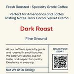 Perfect for Americanos, Lattes, or Shots. Tasting Notes: Dark Cocoa, Velvet Crema. Dark Roast.