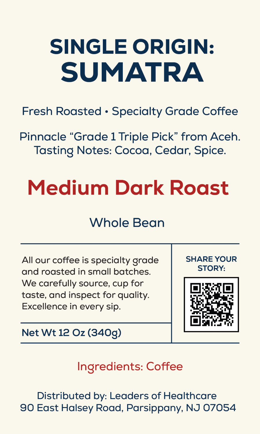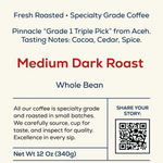 Pinnacle "Grade 1 Triple Pick" from Aceh. Tasting Notes: Cocoa, Cedar, Spice. Medium Dark Roast.